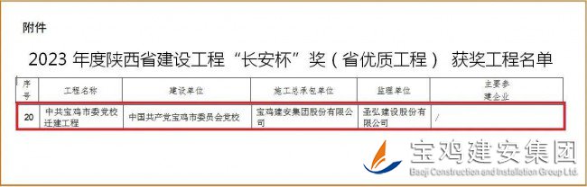 近日,陜西省住房和城鄉(xiāng)建設(shè)廳《關(guān)于公布2023年度陜西省建設(shè)工程長(zhǎng)安杯獎(jiǎng)(省優(yōu)質(zhì)工程)評(píng)選結(jié)果的通知》正式下發(fā),公司承建的中共寶雞市委黨校遷建工程榮登金榜,為集團(tuán)再添一項(xiàng)陜西省建設(shè)工程“長(zhǎng)安杯”獎(jiǎng)。